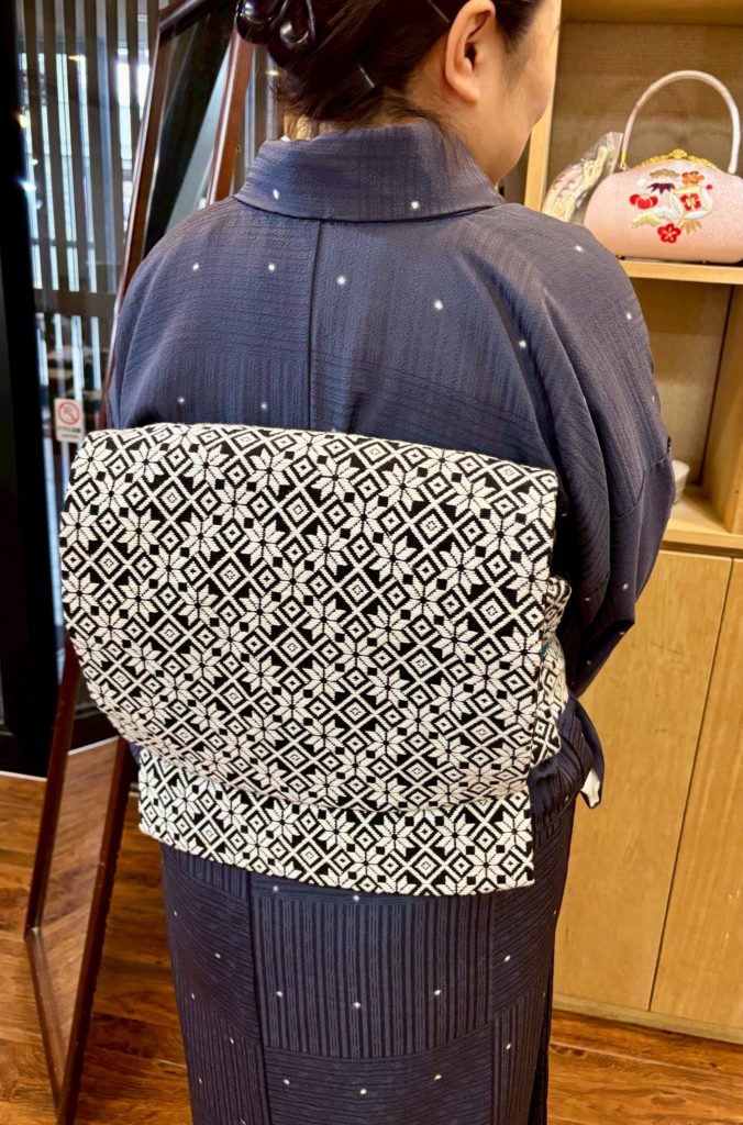 木綿の生地に一針一針丁寧に刺して柄を作る刺し子。こちらの帯は、相当細かい柄で、しかも乱れなくきれいに作られているので、職人さんにも引けを取らないほど美しい仕上がりです。
