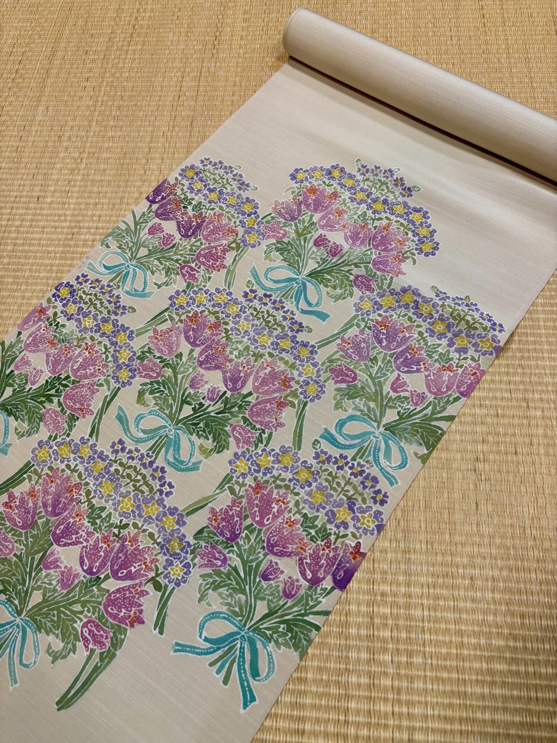 こちらの作品は、ブーケをイメージした名古屋帯で、とても愛らしい帯です。
