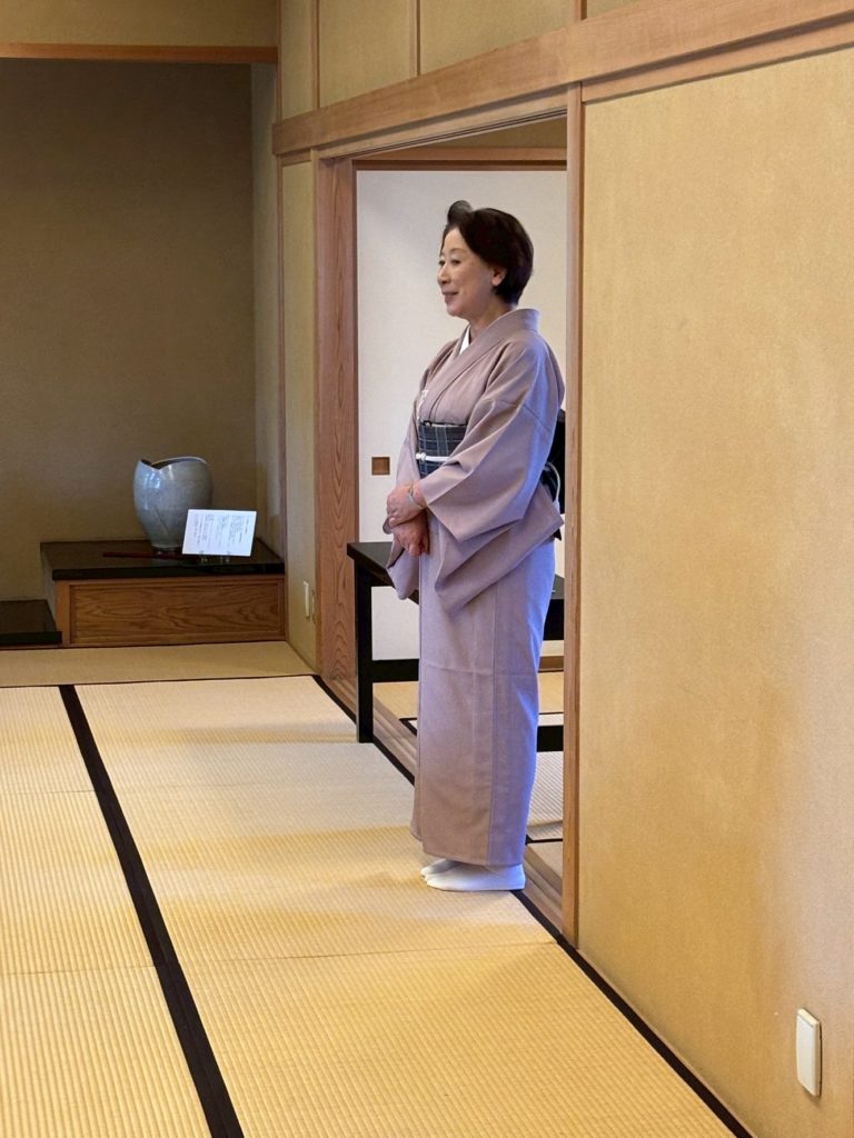 講師は、能登忠様の女将さんにお願いして、和食だけでなく、靴や草履の脱ぎ方やお箸の使い方まで、丁寧に教えていただきました。お料理をいただくときの順番は、口の中が美味しい味で終わるよう配慮されていたり、器の扱い方ではひとつひとつに意味のある所作があり、いただいた後の器も美しくなるよう教えていただき、とても勉強になるひと時でした。