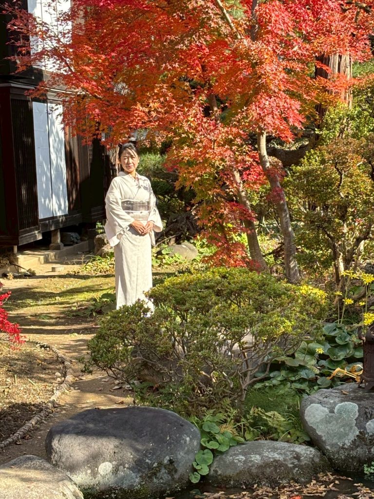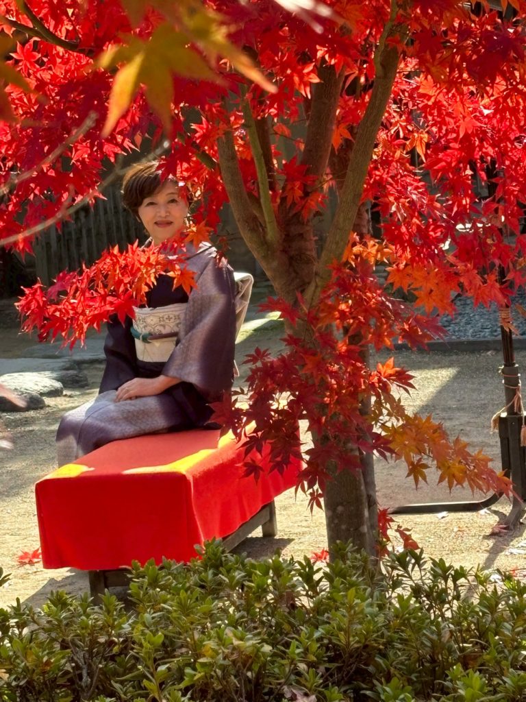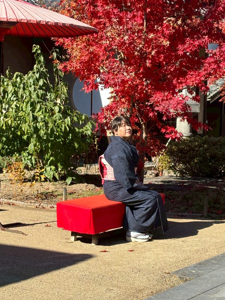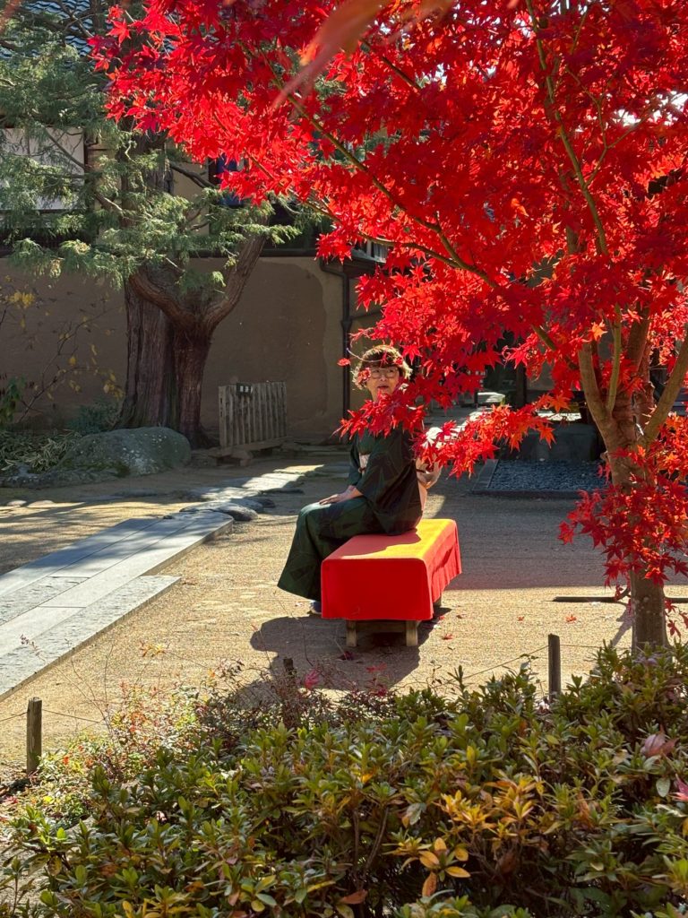 ここ数年で最高の紅葉で、素敵な着物姿と調和して秋らしい写真が撮れました。